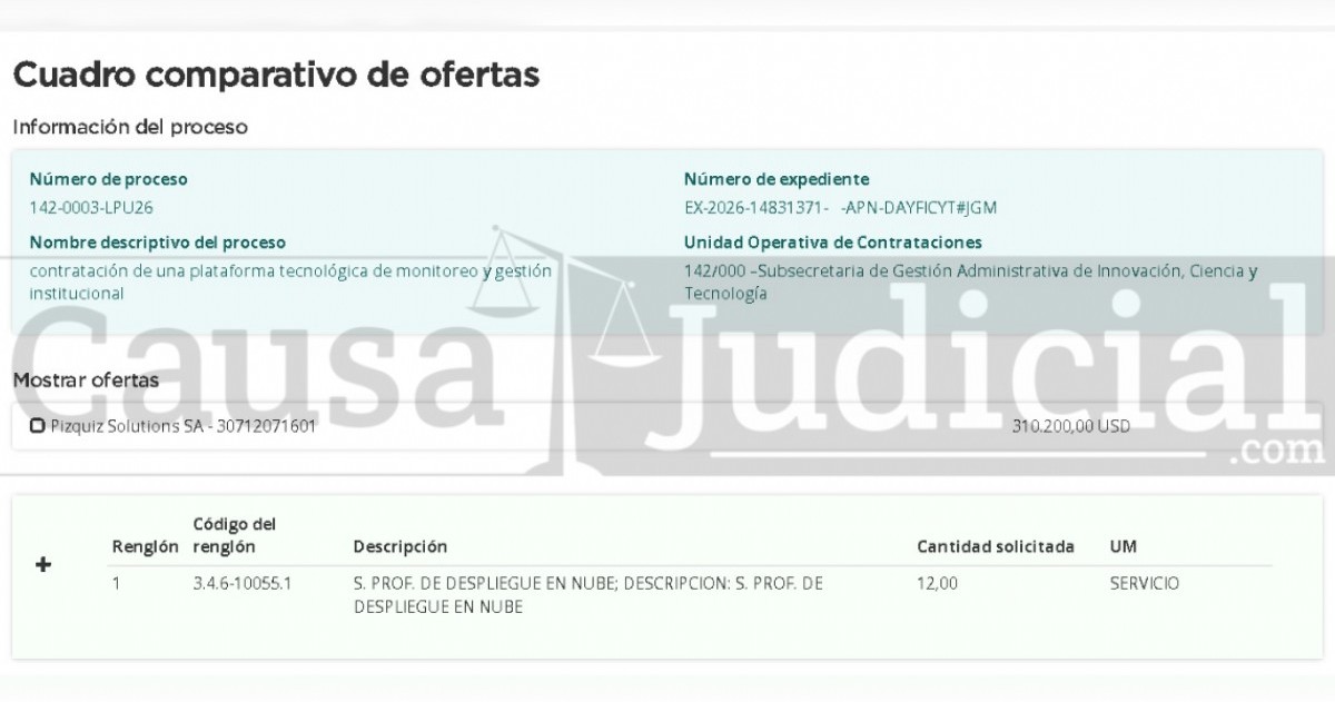 Todo esto por una suma para nada modesta: 310.200,00 dólares que, por el momento, serían otorgados a la empresa Pizquiz Solutions SA, la única que fue aprobada.